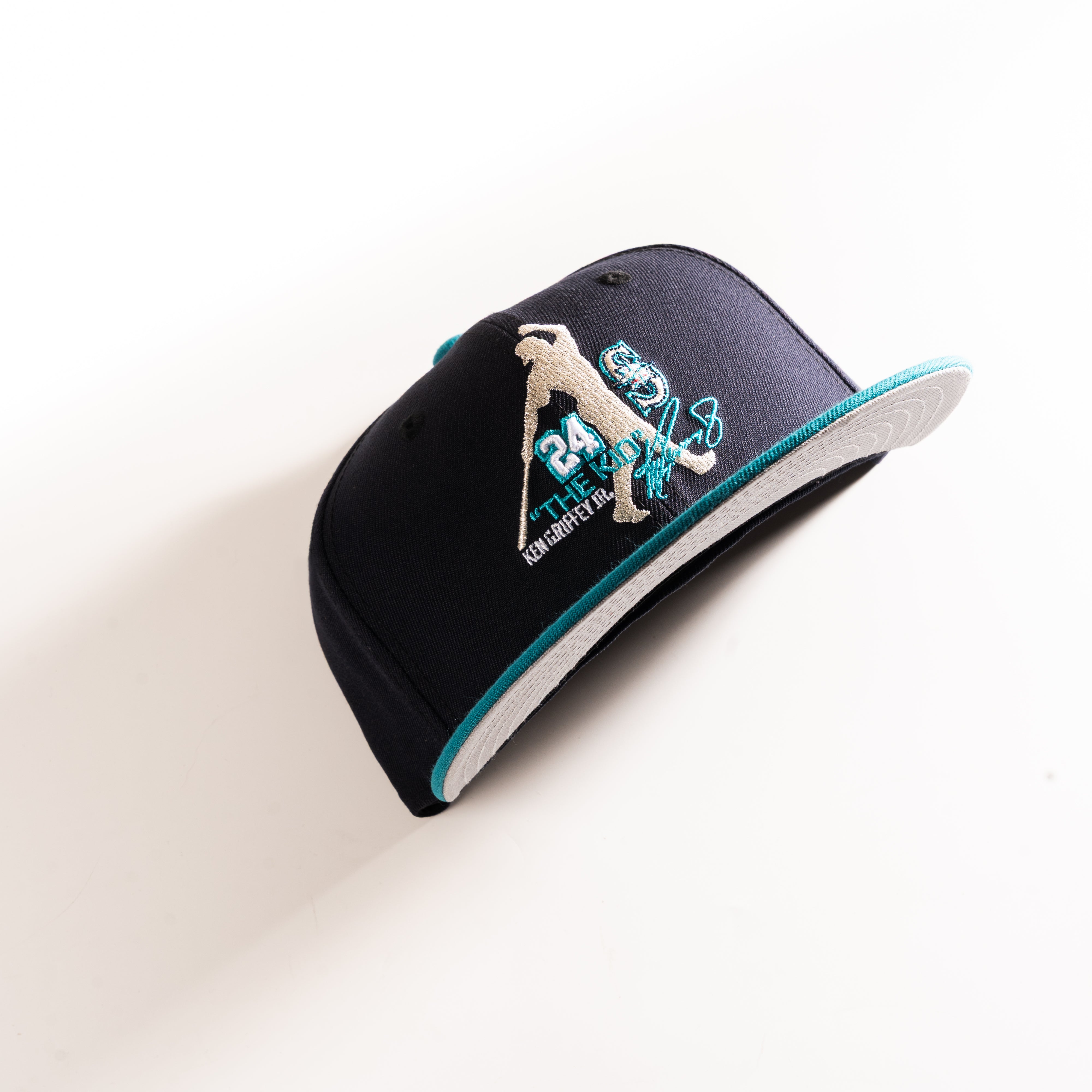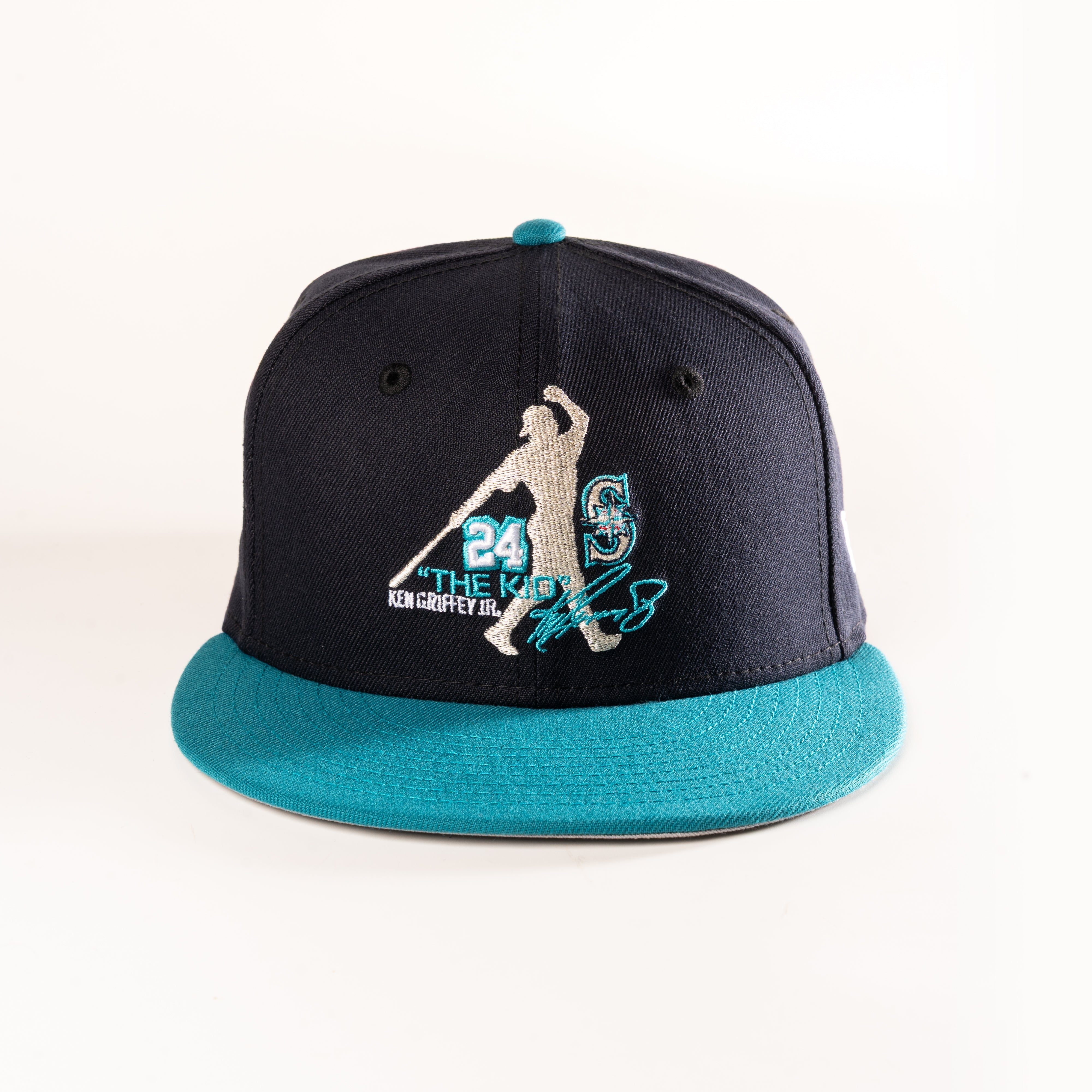 Seattle Mariners 'The Kid' 59Fifty Fitted Hat Features: 59Fifty Fitted Hat 100% Polyester Navy Crown Aqua Visor Grey Undervisor Black Sweatband Made... Read more